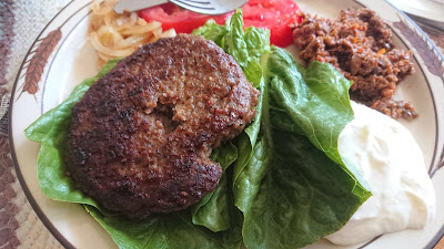 Kl. 12. Dagens lunch består av hamburgare, grönsaker, stekt lök fetaostdressing och en olivröra. Gott men det var egentligen för varmt för att stå och steka.