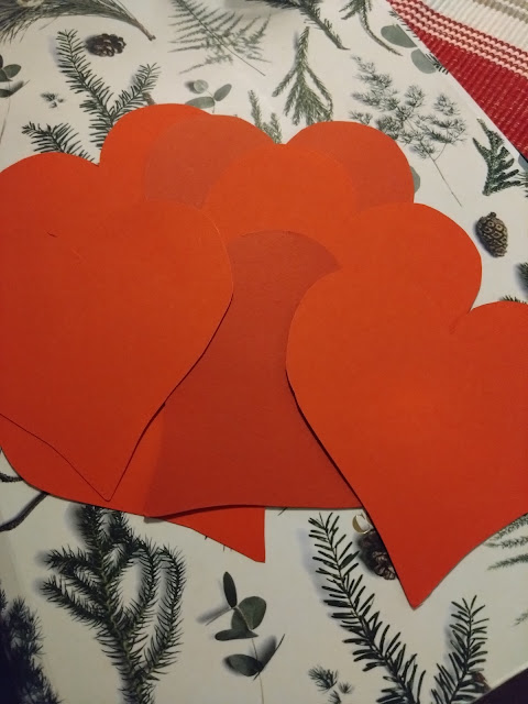 Kl. 19. Det blir även en del jobb idag. Jar börjat klippa ut några av de hjärtan jag skrivit i. Men nu behöver händerna vila